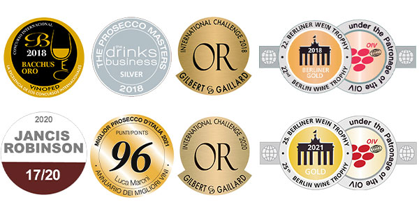 Diplom von Gran Merito und Silbermedaille “Mostra dei vini e delle grappe di Vittorio Veneto”, Teil des Projektes “Primavera del Prosecco”. Eingetragen im Guide “Annuario dei migliori Vini Italiani - die besten Weine Italiens” von Luca Maroni, RCS Libri.